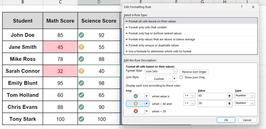 Pro Tip: By default, Excel calculates the split based on percentiles (top 33% gets green). To customize this, go to Manage Rules > Edit Rule and change the Types to “Number” to set your own passing thresholds.