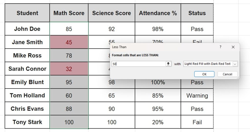 Instantly, all failing grades are highlighted. If you change a score from 45 to 80, the red highlight disappears automatically.