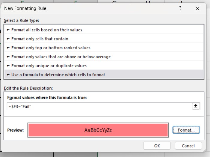 Step 4: Write the Formula We want to check if the “Status” column (Column E) says “Fail”. Type this formula: =$F3="Fail"