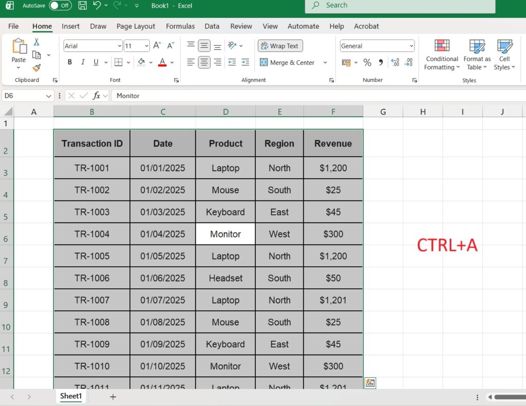 - Ctrl + Arrow Key: Jump to the edge of the data region.